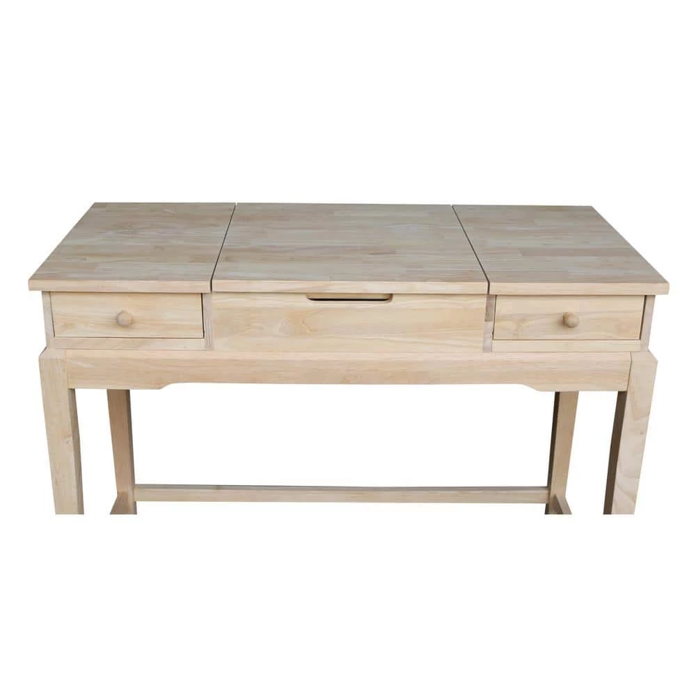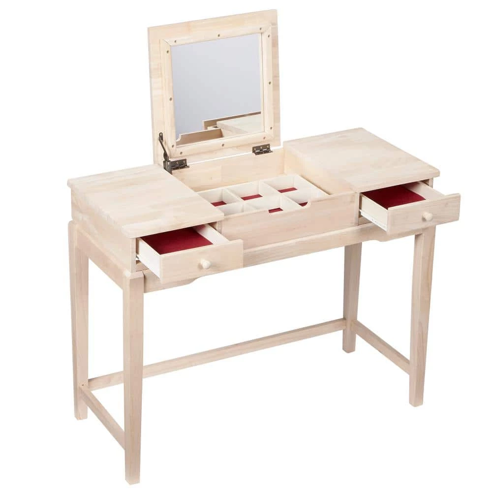 This deluxe vanity set by International Concepts is crafted from solid hardwood. This eco-friendly hardwood will last generations to come once finished to your desired stain or paint. Comes with a 13 in. mirror, wood organizer insert and felt lining. A perfect gift! Paint it her favorite color!