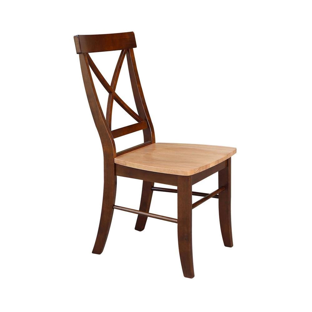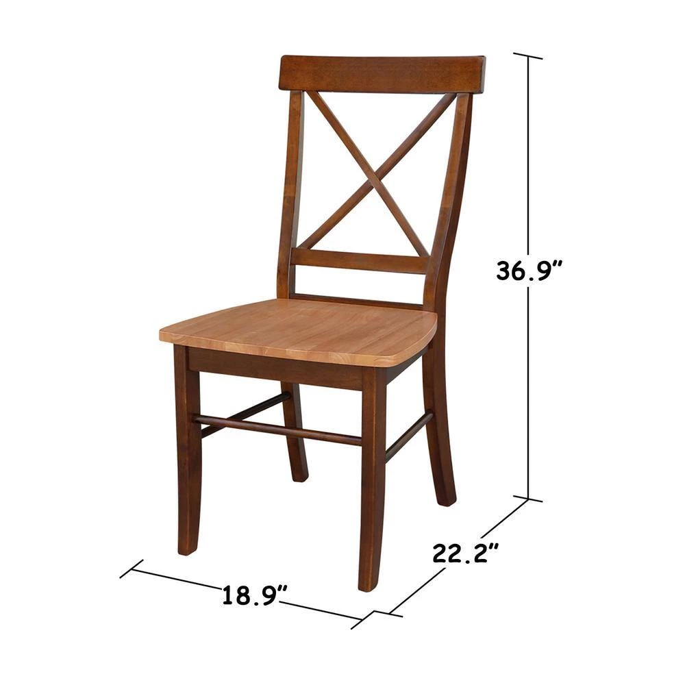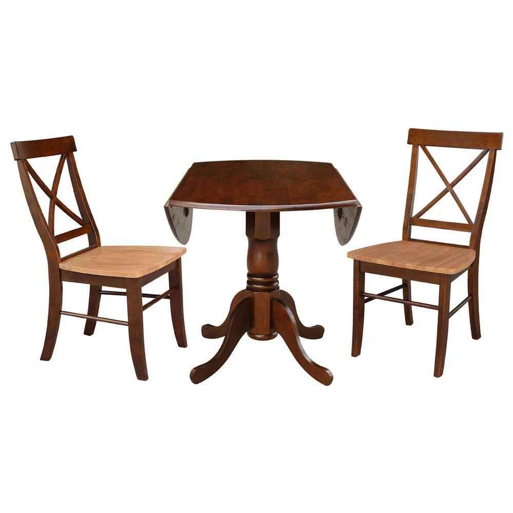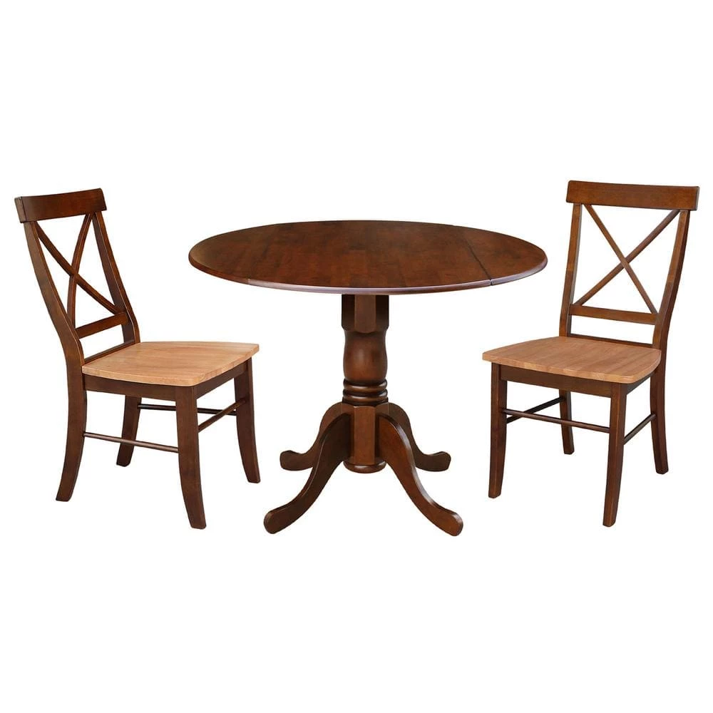 This classic 42 in. round dropleaf table is finished in a warm 2-tone finish. The 3-piece set comes with 2-Emily chairs which are comfortable updated X-back chairs. The set is all solid wood made from plantation grown rubberwood; an asian hardwood. International Concepts has been crafting fine solid wood home furnishings since 1982 and stands behind their products.