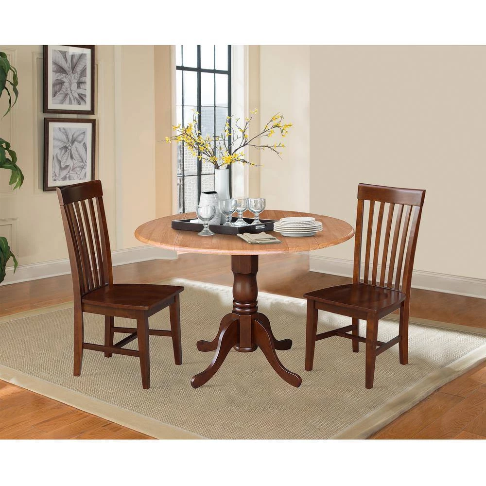 Much of today’s home furnishings are made from particle or MDF covered in veneer. If you want a piece of furniture that will stand the test of time, you should buy solid wood. International Concepts is well known for our quality solid wood home furnishings. Being in business since 1982, we know our furniture has the solid wood construction that stands the test of time. This 3-piece dining set features our most popular 42 in. drop leaf table paired with our comfortable and stylish Tall mission chair. Finished in premium and rich cinnamon and espresso stain and protective pre-catalyzed lacquer top coat. You can purchase extra chairs by searching for model # C581-465P.