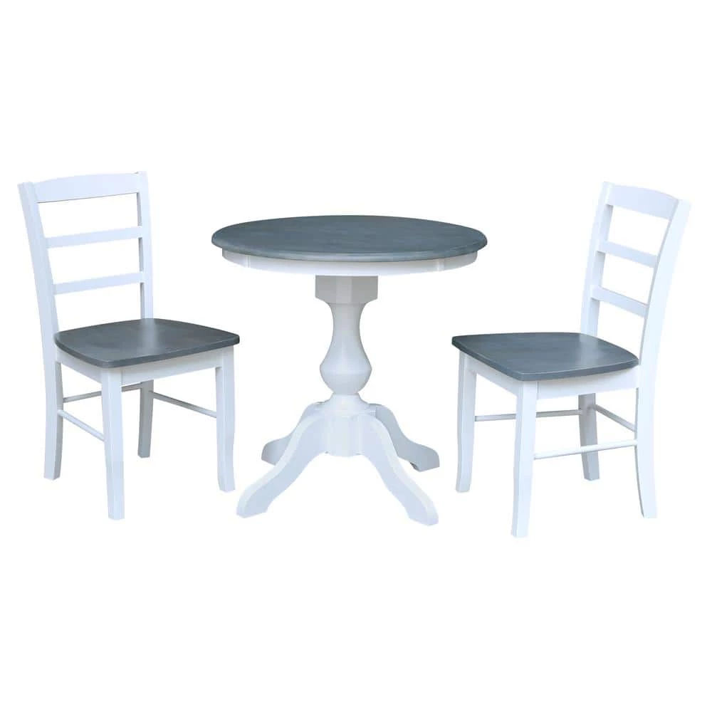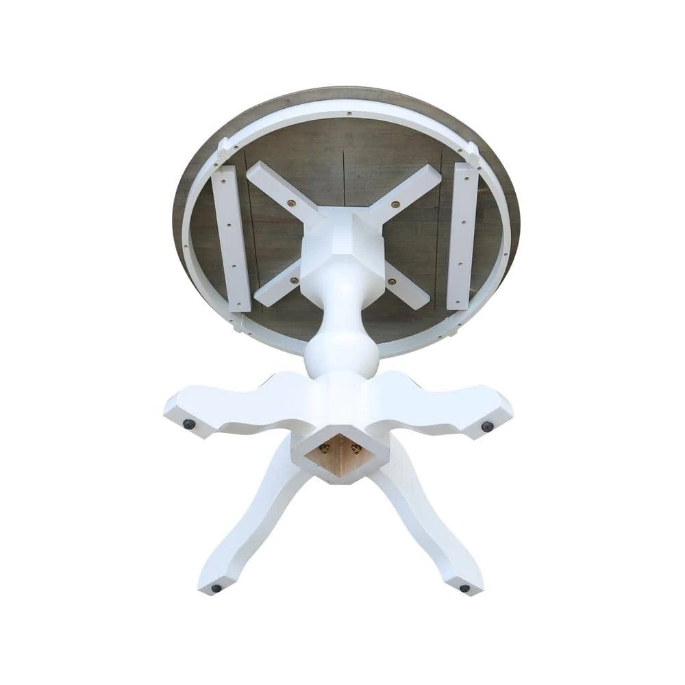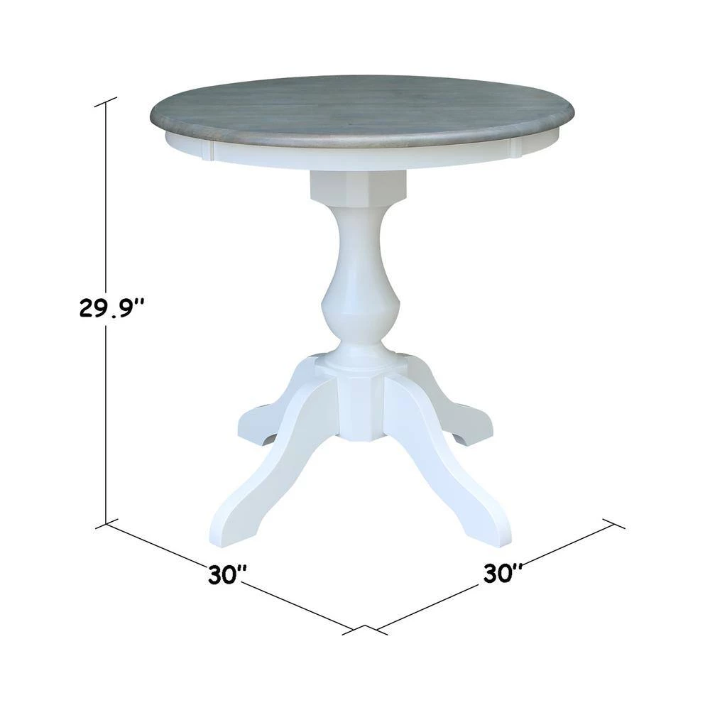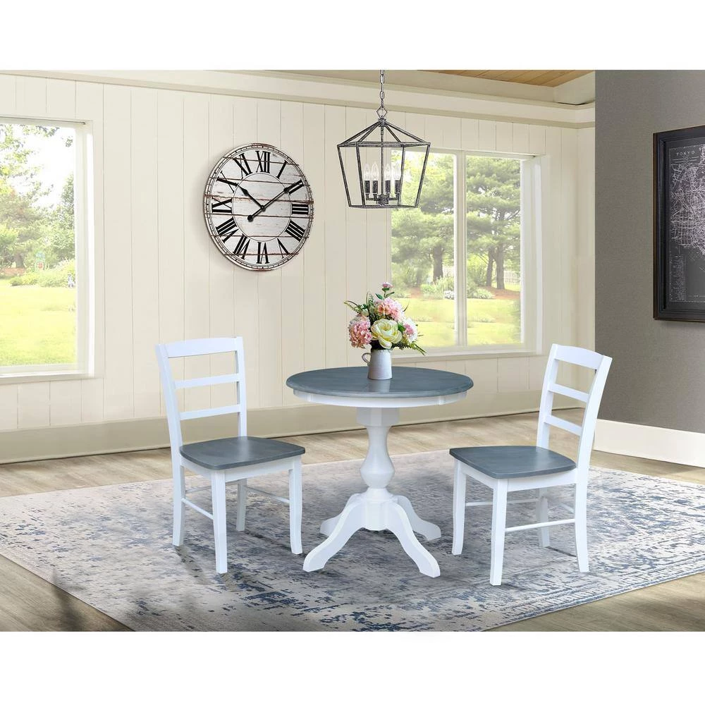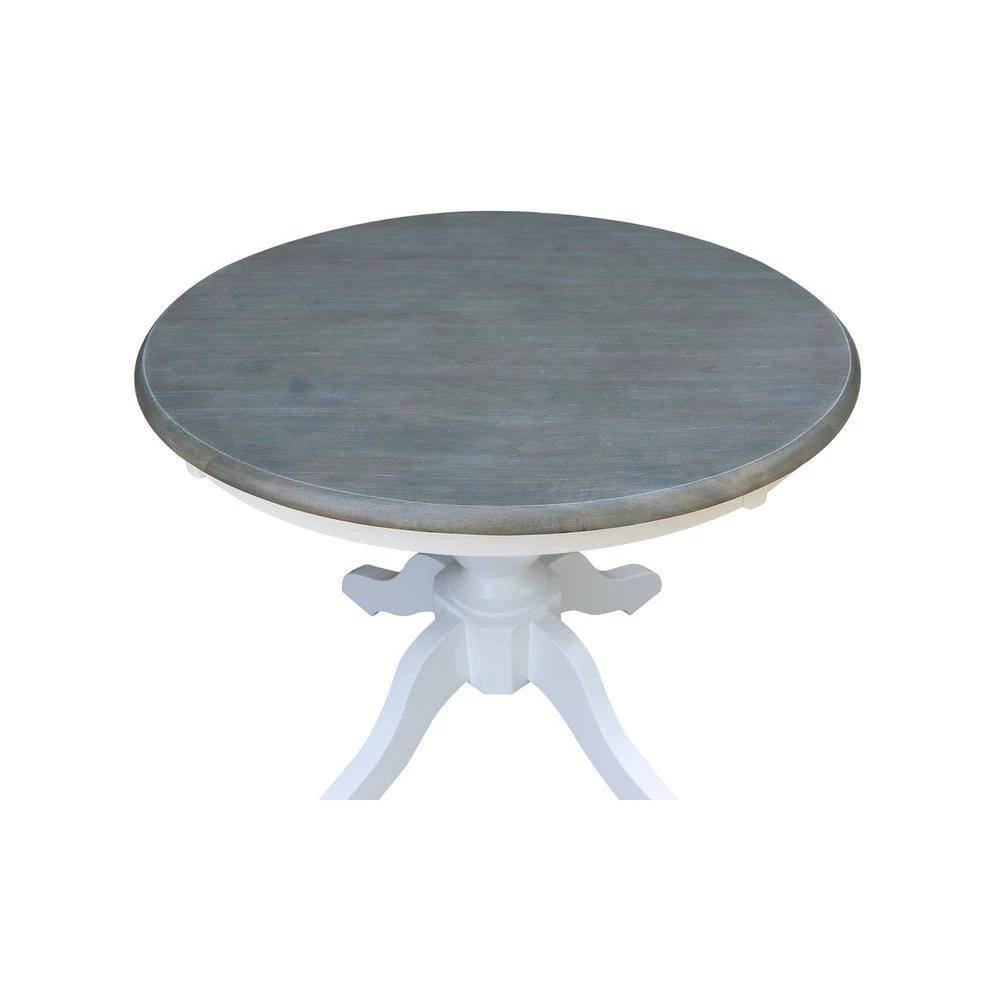 This dining set is beautifully finished with a brushed gray top and bright white apron and pedestal. Matching chairs with white frame and gray seat. This dining set is built to last with the quality, value and style International Concepts is known for. International Concepts has been building quality solid wood home furnishings since 1982. We hope you will enjoy your dining set for many years.