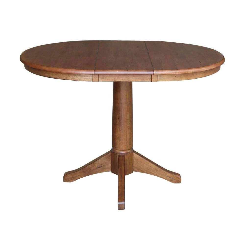 This beautiful distressed oak solid wood pedestal table set from International Concepts is perfect for your everyday dining. The solid hardwood top features a 12 in. leaf to expand table from 36 in. round to 48 in. x 36 in. oval. The steel guides and quality craftsmanship make it easy to pop the leaf in and out to suit your needs. The whole set is finished in a beautiful oak stain with a light distressing. A pre-catalyzed top coat protects the table from daily wear. Easy to clean, simply wipe with a damp cloth. Trust us with your dining needs as International Concepts has been manufacturing quality furnishings since 1979.