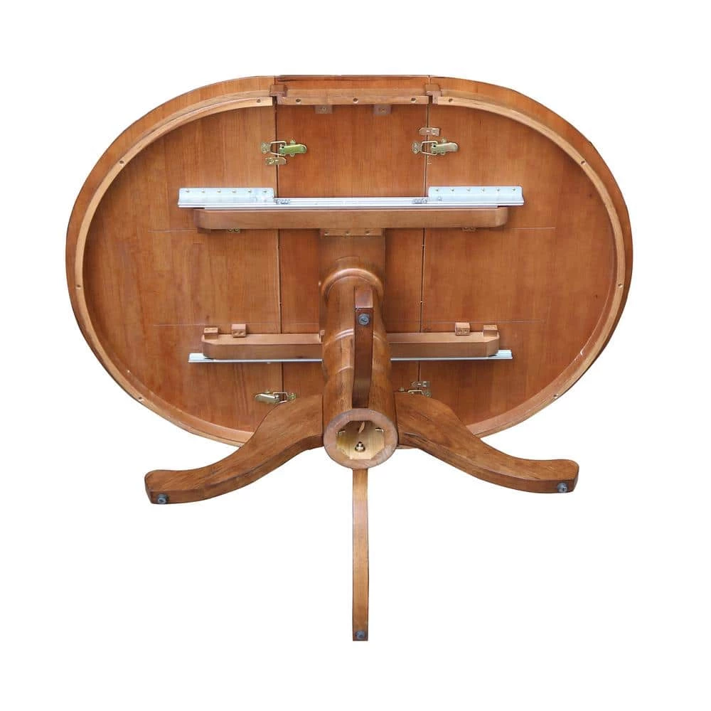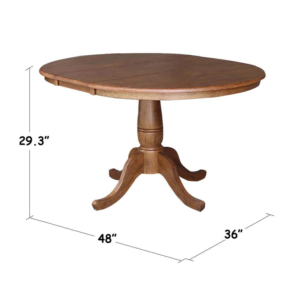 This beautiful distressed oak solid wood pedestal table set from International Concepts is perfect for your everyday dining. The solid hardwood top features a 12 in. leaf to expand table from 36 in. round to 48 in. x 36 in. oval. The steel guides and quality craftsmanship make it easy to pop the leaf in and out to suit your needs. The whole set is finished in a beautiful oak stain with a light distressing. A pre-catalyzed top coat protects the table from daily wear. Easy to clean, simply wipe with a damp cloth. Trust us with your dining needs as International Concepts has been manufacturing quality furnishings since 1979.