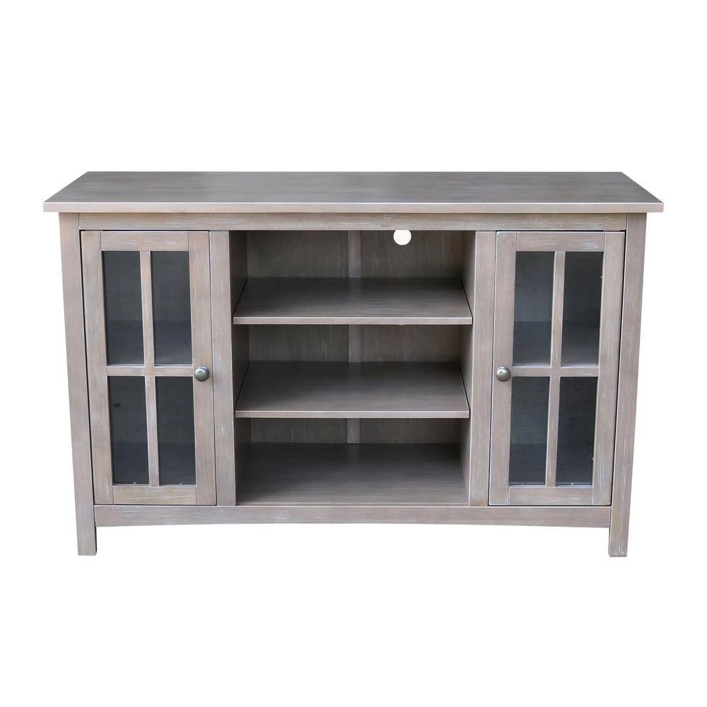 - Premium weathered taupe gray finish features: glass doors, solid hardwood