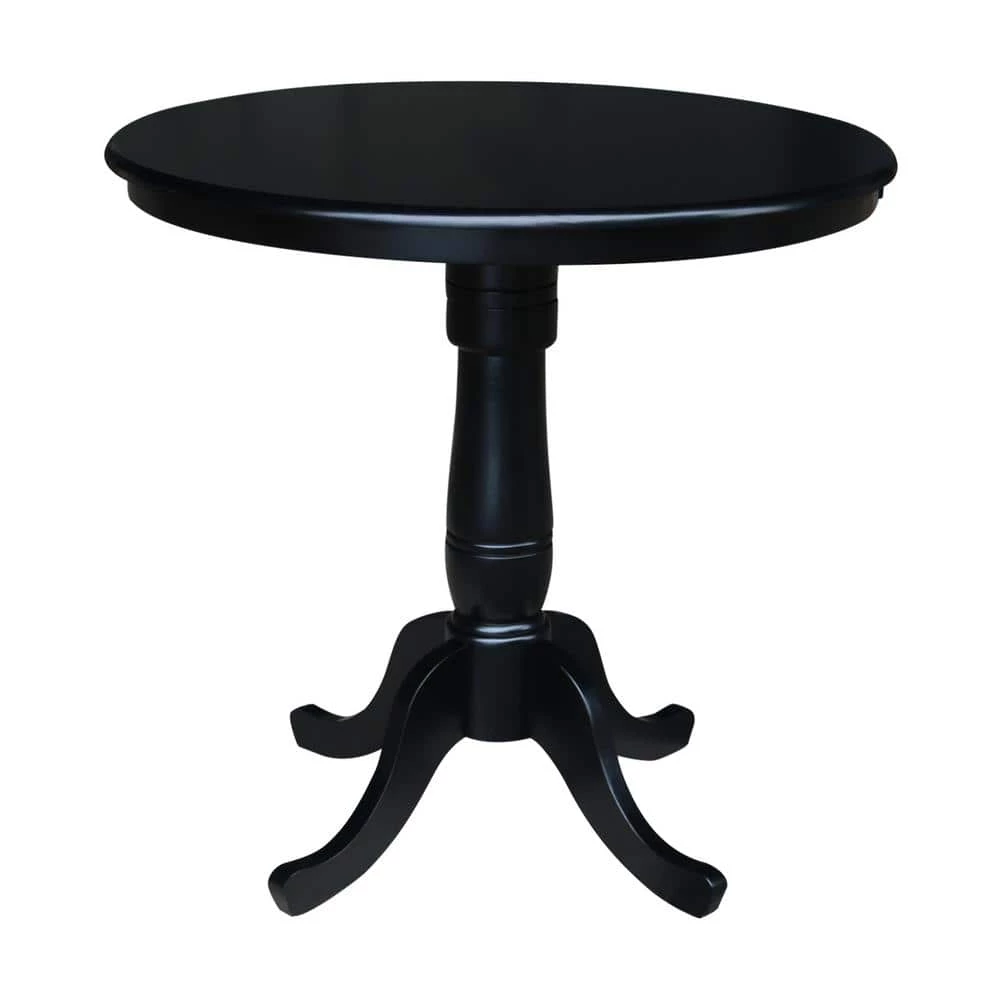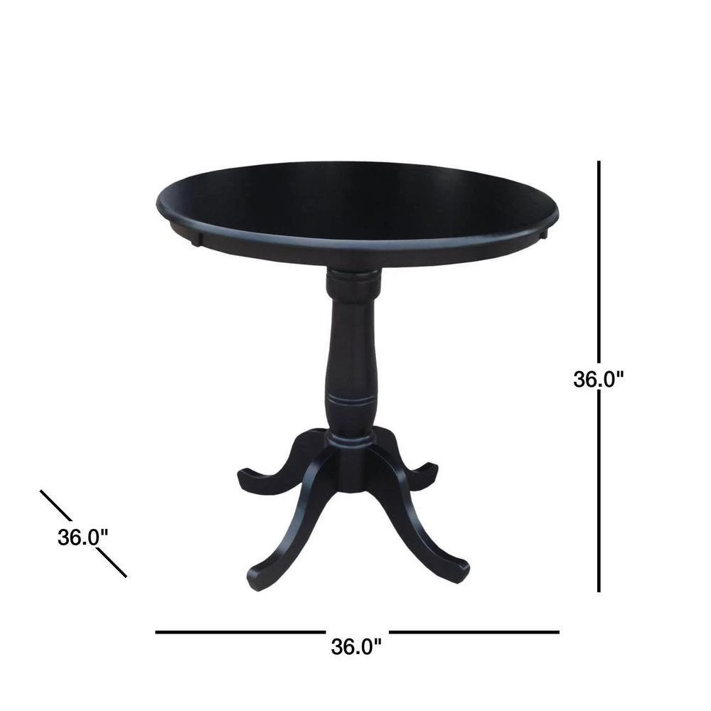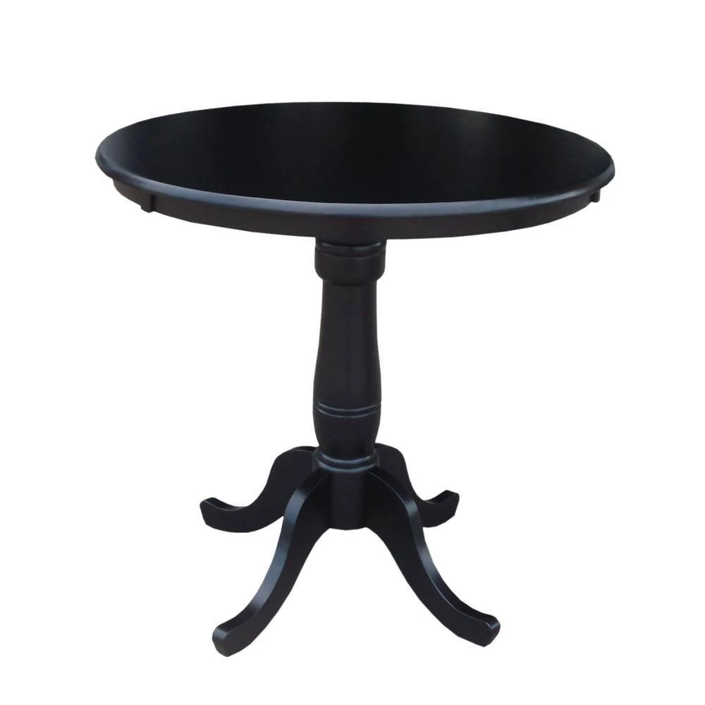 This traditional pedestal table is 36 in. round and great size for 4 people to sit comfortably. This International Concepts table features a butcher block top and comes in a variety of finishes. Look for matching International Concepts 24 in. barstools.