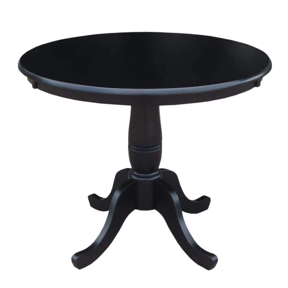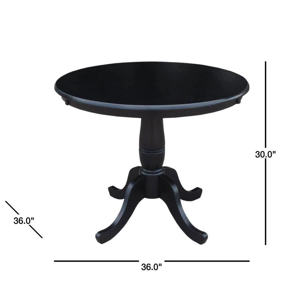 This traditional pedestal table is 36 in. round and great size for 4 people to sit comfortably. This International Concepts table features a butcher block top and comes in a variety of finishes. Look for matching International Concepts dining chairs.
