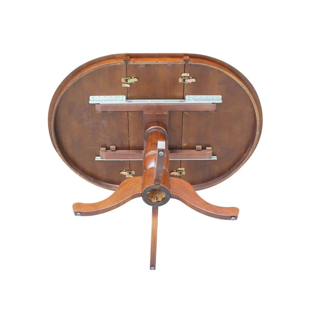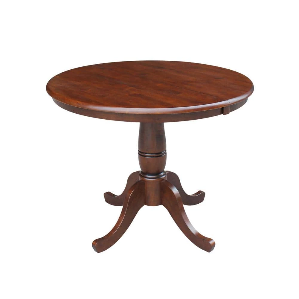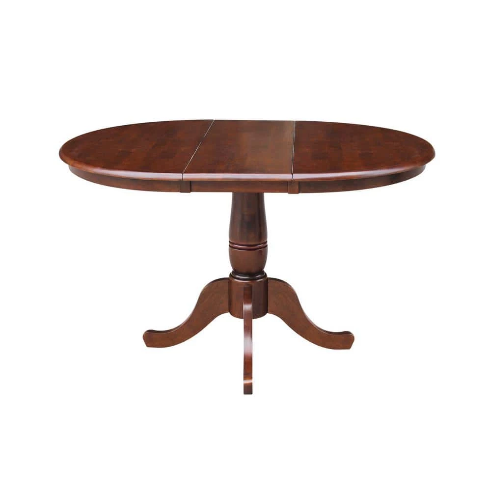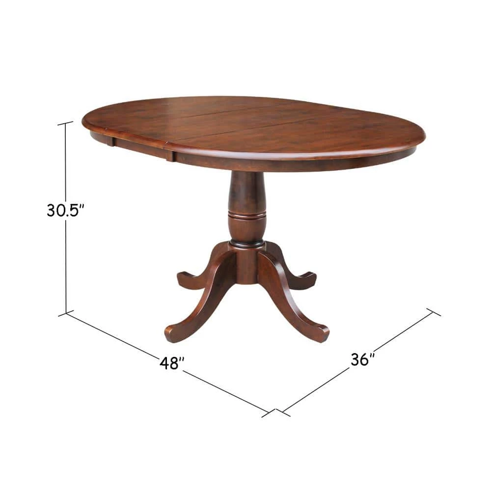 This beautiful solid wood pedestal table from International Concepts is perfect for seating 4-people to 6-people. The solid hardwood top features a 12 in. leaf to expand table from 36 in. round to 48 in. x 36 in. oval. The steel guides and quality craftsmanship make it easy to pop the leaf in and out to suit your needs. The table comes in a variety of premium finishes or you can also buy it unfinished. Look for coordinating dining chairs from International Concepts Dining Essentials collection. Trust us with your dining needs as International Concepts has been manufacturing quality furnishings since 1979.