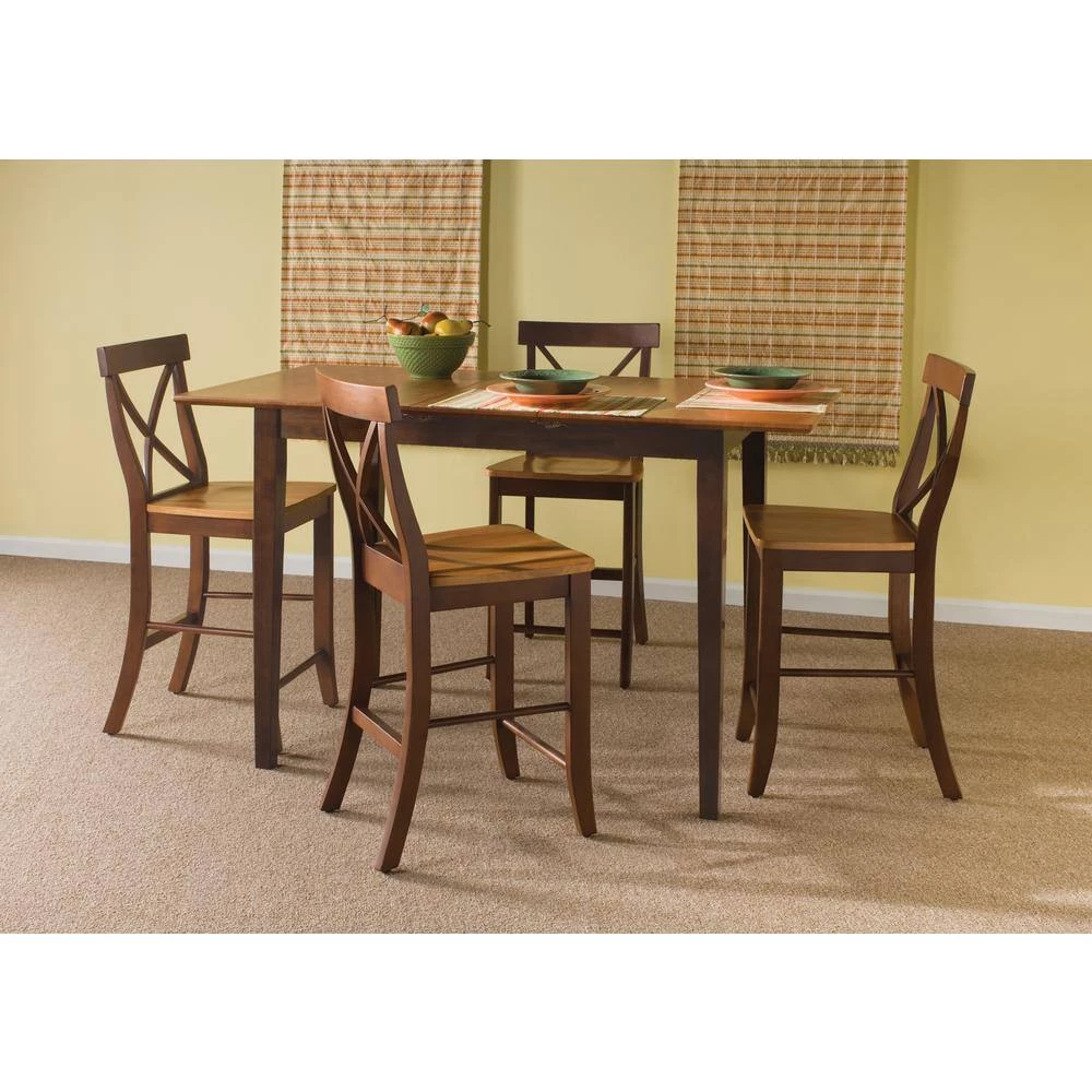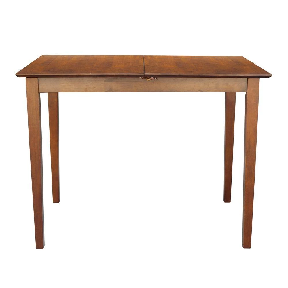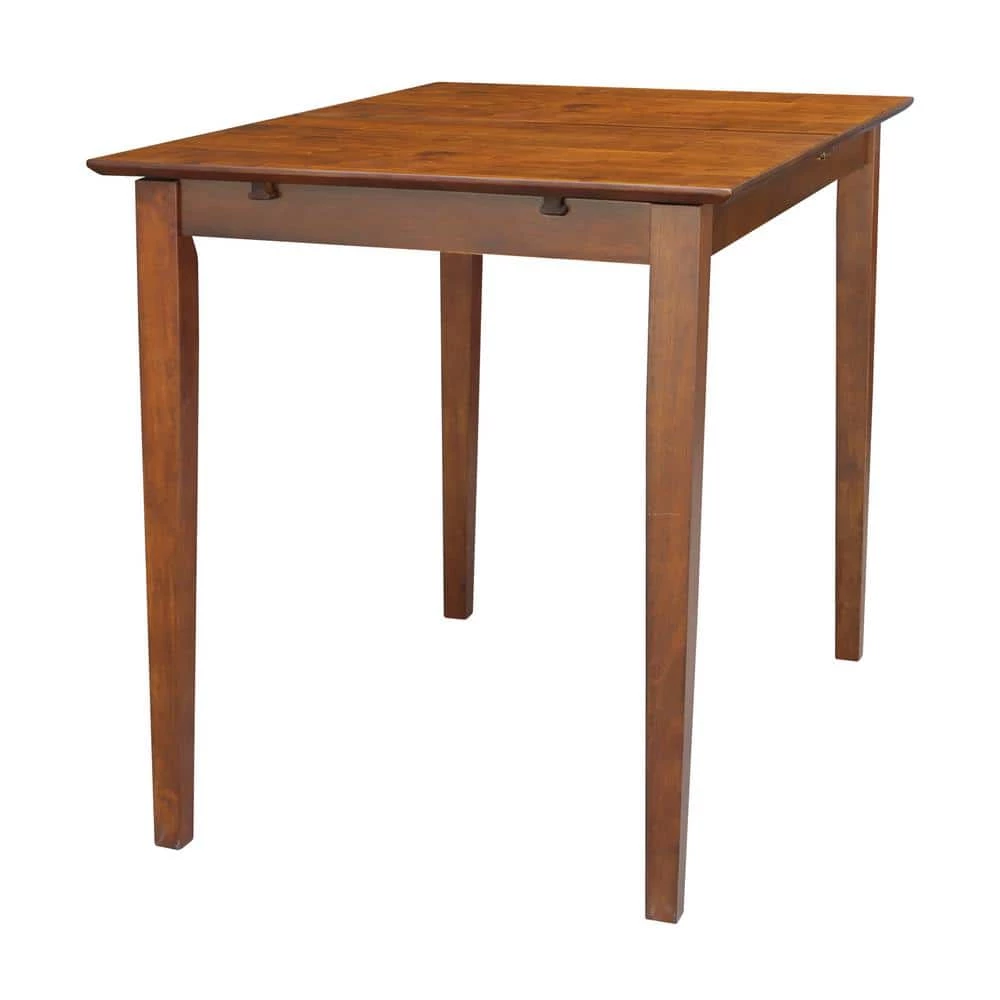 This shaker table is the perfect counter height dining table for small spaces. The butterfly leaf self stores inside the table when not in use. With the leaf up you can seat six people. The top features a butcher block look; crafted from solid rubberwood. This table is available in a variety of finishes and pairs with international concepts stools.