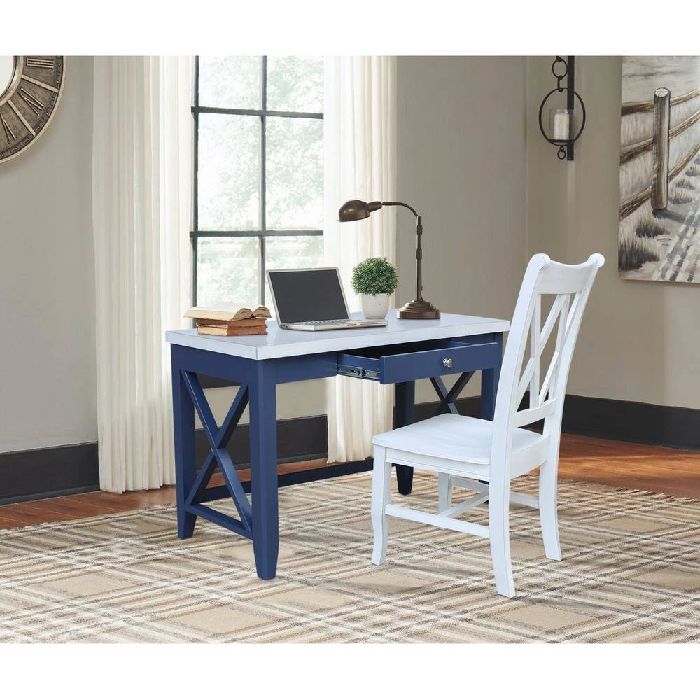 This stylish desk is finished with a marble white top and navy blue base. This desk is 100% solid wood. The best furniture is made from real wood. Consider the longevity of antique furnishings, beautifully crafted from real, solid wood, handed down for generations and still in great condition after decades of use. Today we use eco-friendly hardwood known as Rubberwood. Your home is your castle and so the furnishings you choose for it should be pieces selected not only for their style, but for the craftsmanship that went into making them. International Concepts has been crafting quality solid wood furniture since 1979.