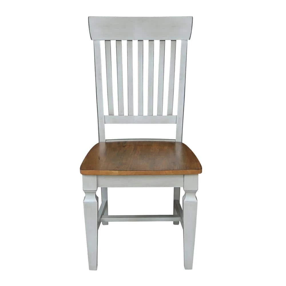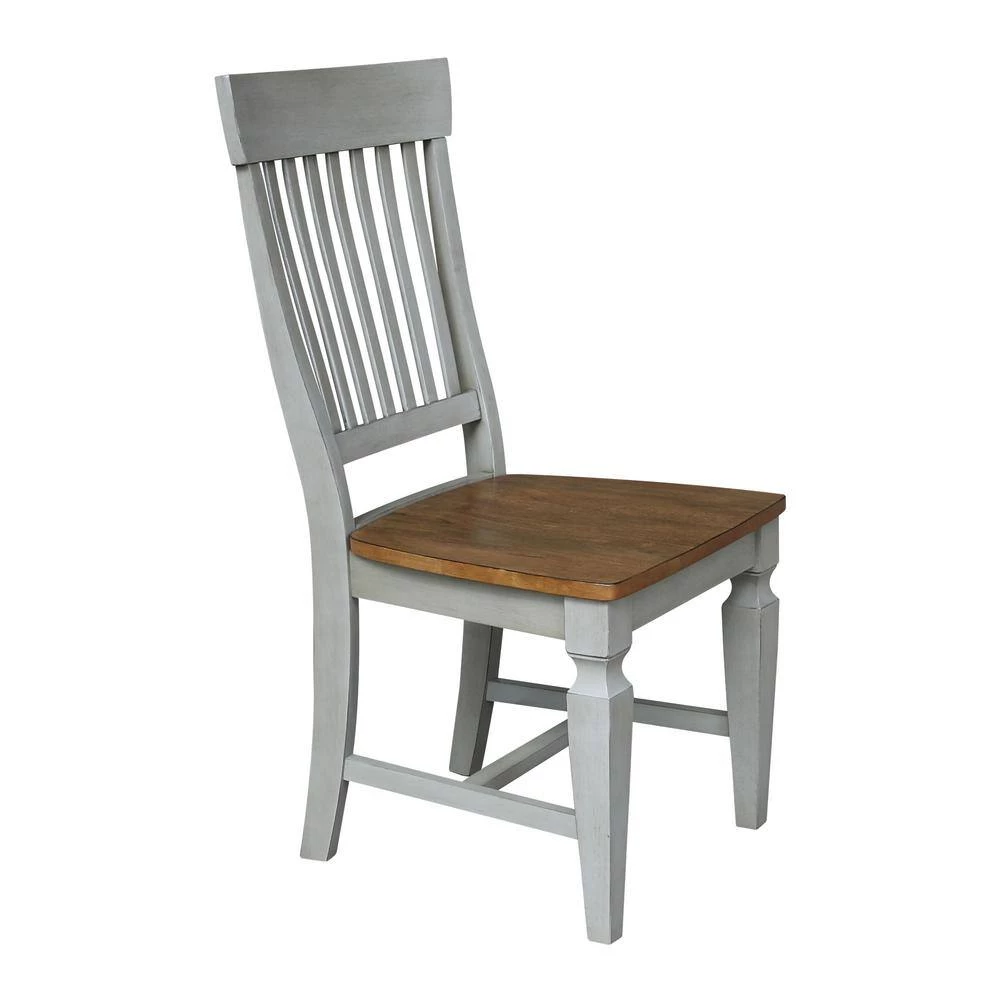The Vista Chair in hickory and stone is a very elegant chair. The frame is painted a medium gray and the seat is a hickory color stain. The chair features a carved front leg, stretchers, and box seat construction. The chair is made from 100% solid hardwood and is very durable.