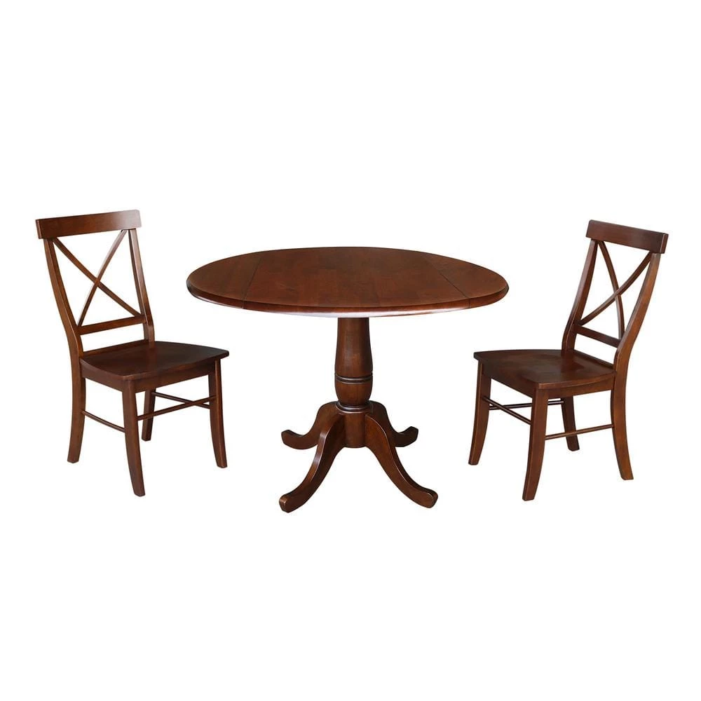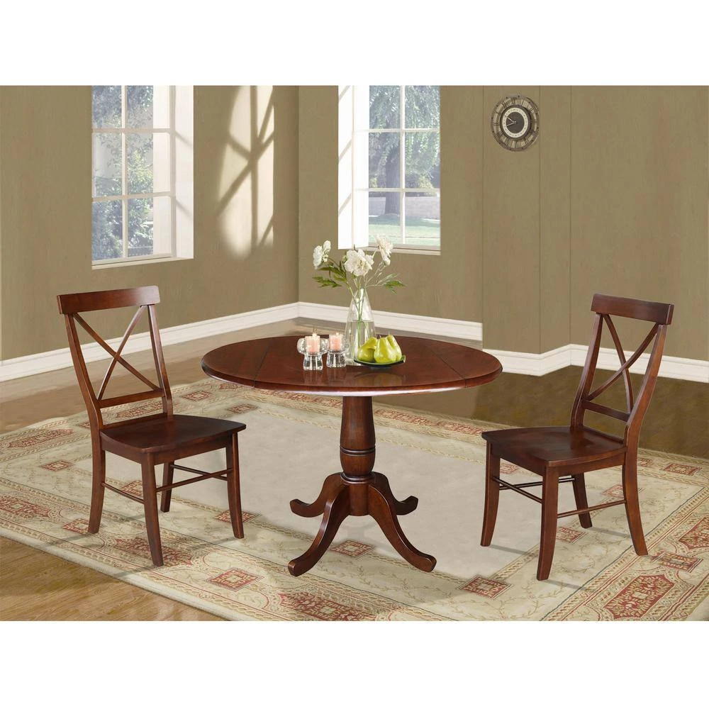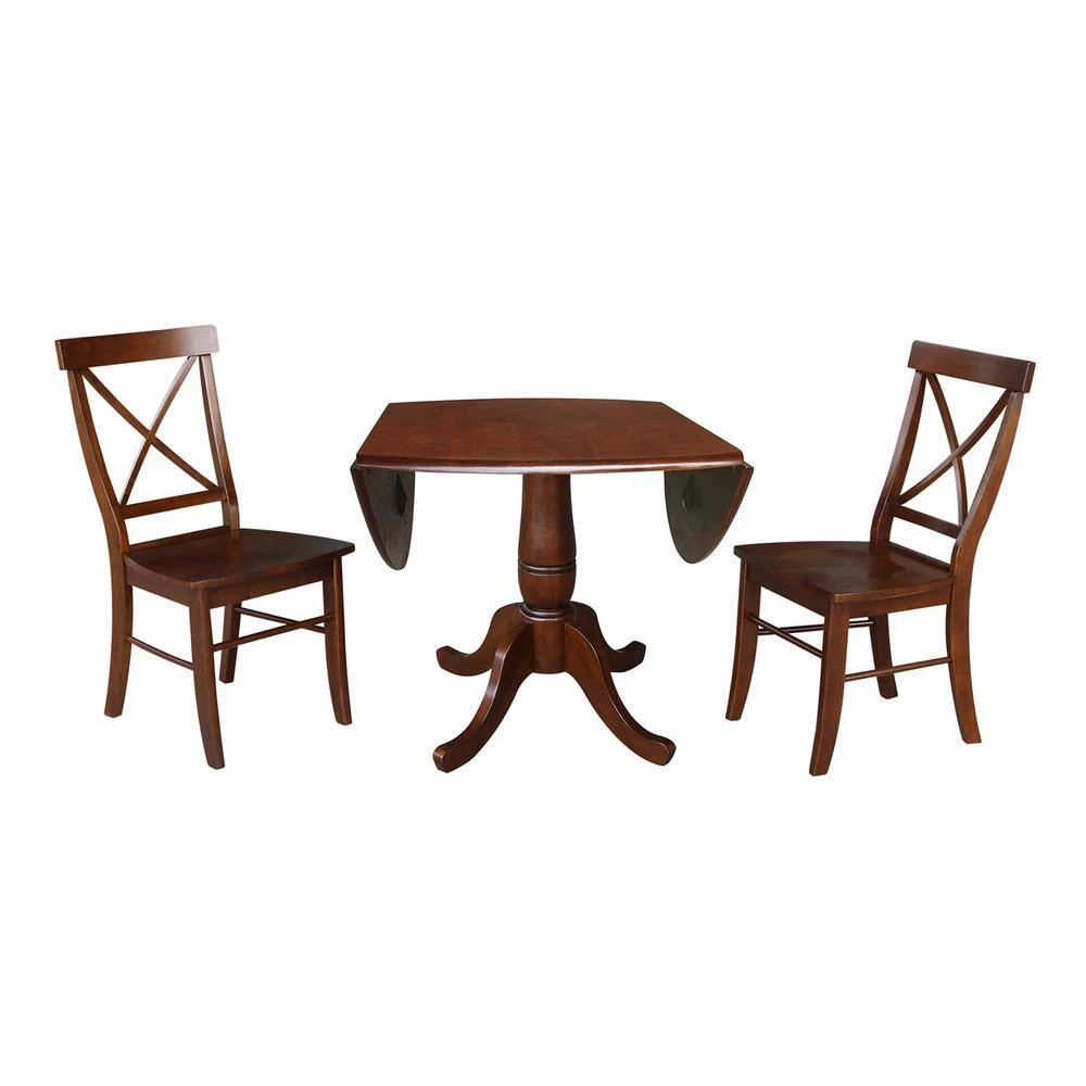 Much of today’s home furnishings are made from particle or mdf covered in veneer. If you want a piece of furniture that will stand the test of time, you should buy solid wood. International Concepts is well known for our quality solid wood home furnishings. Being in business since 1982, we know our furniture has the solid wood construction that stands the test of time. This 3-piece dining set features our most popular 42 in. drop leaf table with a beautiful pedestal paired with comfortable and stylish seating. Finished with a premium protective pre-catalyzed lacquer top coat for top of the line durability. You can purchase extra seating separately as well.