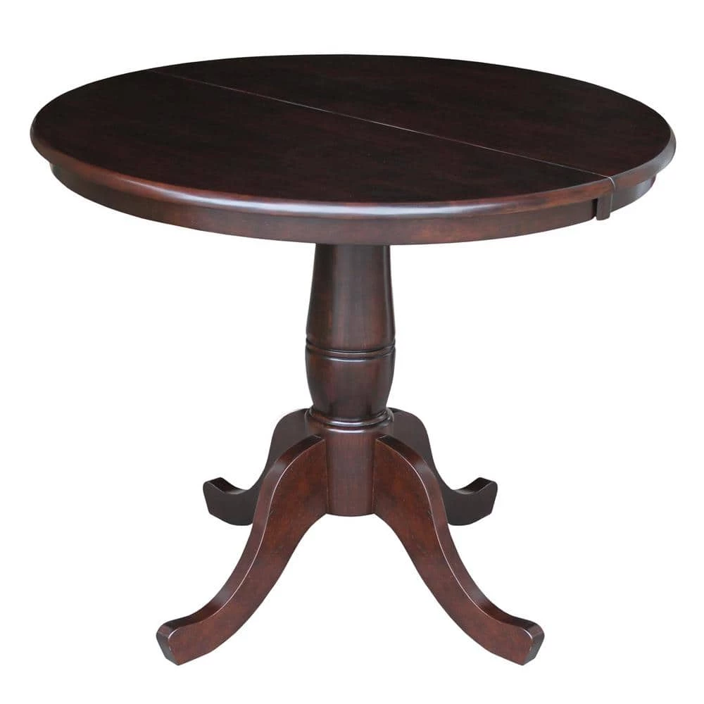 This beautiful solid wood pedestal table from International Concepts is perfect for seating 4 people. The solid hardwood top features a 12 in. leaf to expand table from 36 in. round to 48 in. x 36 in. oval. The steel guides and quality craftsmanship make it easy to pop the leaf in and out to suit your needs. The table comes in a variety of premium finishes or you can also buy it unfinished. Look for coordinating dining chairs from International Concepts collection. Trust us with your dining needs as International Concepts has been manufacturing quality furnishings since 1979.