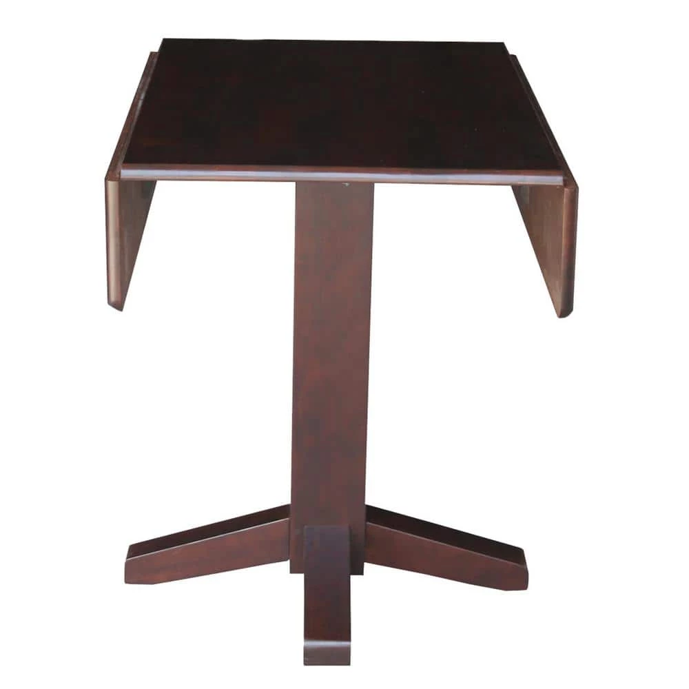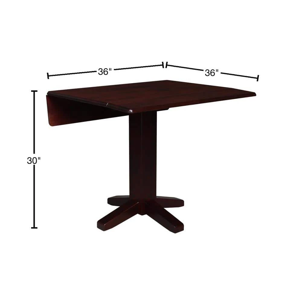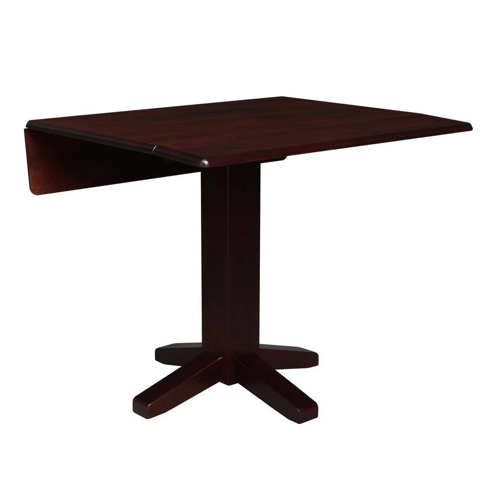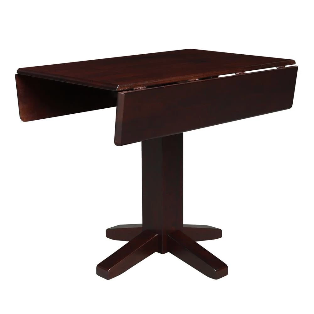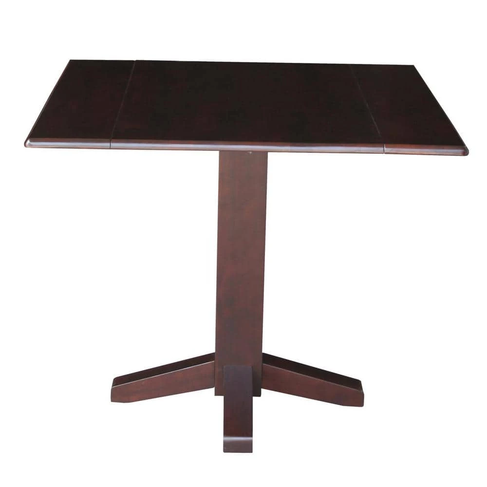 This dual drop leaf table is great for small spaces. With the two 7 in. dropleaves down the table is 24 in. x 36 in. and 36 in. square when they are up. Solid wood with a butcher block top and comes in three color choices. Pair it with International Concepts dining chairs.