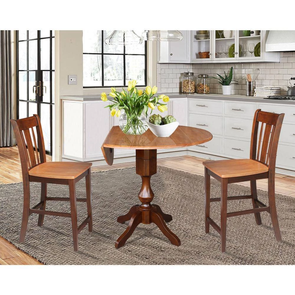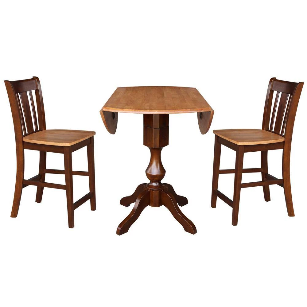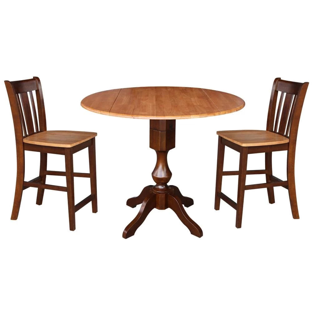 Much of today’s home furnishings are made from particle or mdf covered in veneer. If you want a piece of furniture that will stand the test of time, you should buy solid wood. International Concepts is well known for our quality solid wood home furnishings. Being in business since 1982, we know our furniture has the solid wood construction that stands the test of time. This 3-piece dining set features our most popular 42 in. drop leaf table with a beautiful pedestal paired with comfortable and stylish seating. Finished with a premium protective pre-catalyzed lacquer top coat for top of the line durability. You can purchase extra seating separately as well.