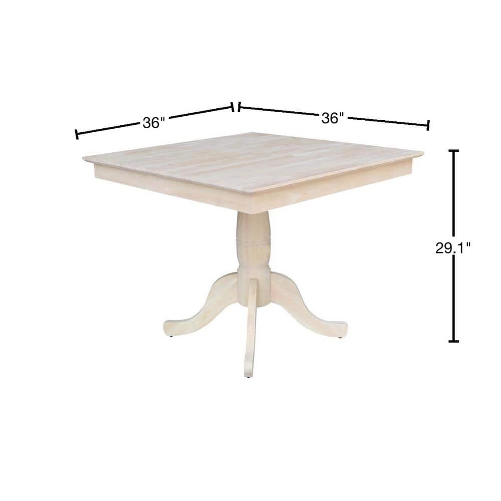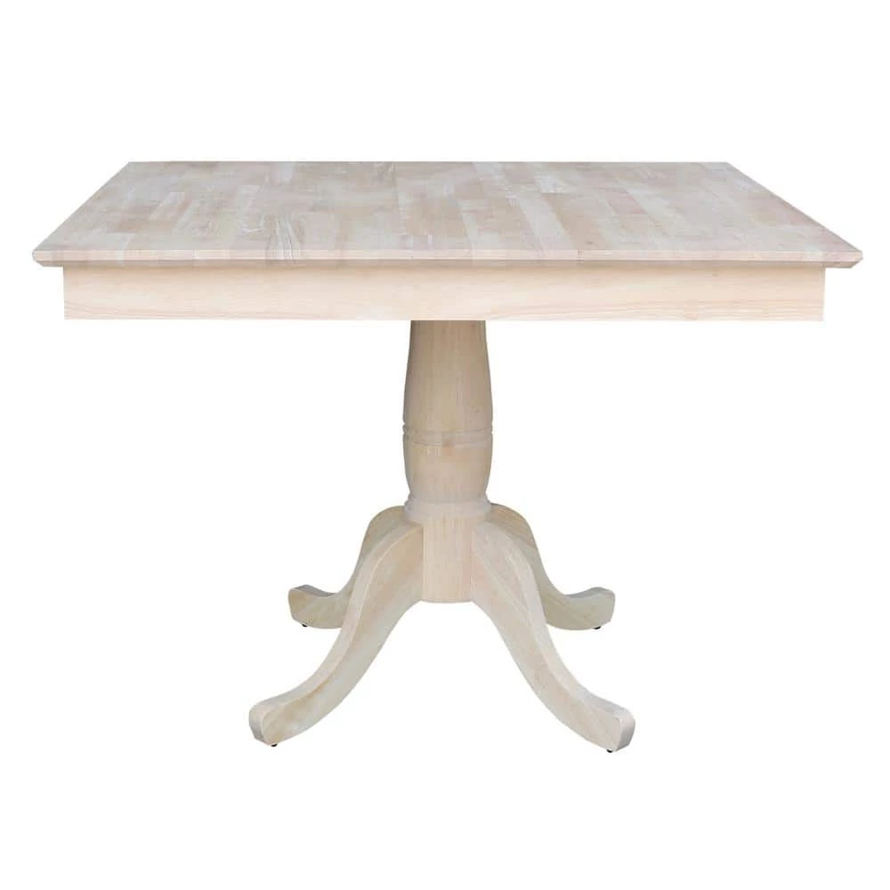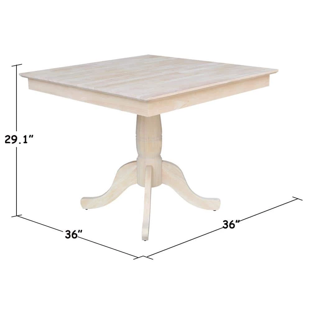 This ready to finish dining table gives you unlimited color options! 100% solid wood, sanded smooth and ready to for you to paint, stain, whitewash, or lacquer. The choice is yours to match your decor or make something unique. The square dining pedestal table gives the flexibility to gather and move around the table without the restrictions of table legs. Unfinished International Concepts dining chairs available for purchase separately. International Concepts has been manufacturing quality solid wood home furnishings since 1979. They stand behind their products value and durability.