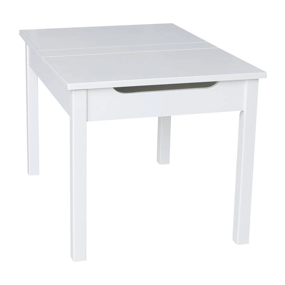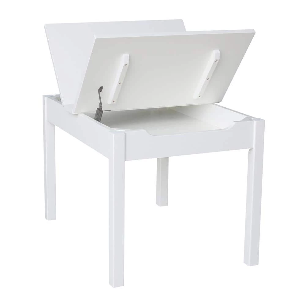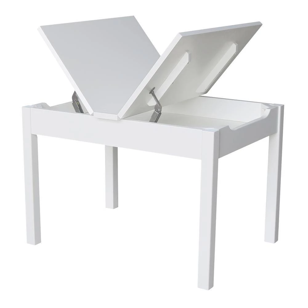This bright white child’s table features storage underneath the top perfect place for kid’s coloring books and crayons to go. Your little ones will love having a table of their own. Ours is made from solid wood so it will stand up to years of abuse. The finish also features a pre-catalyzed lacquer for a durable finish as well. Both sides of the table top lift up for lots of storage and the strong hinge makes it very easy to open and come down for a soft close. Look for our matching kid’s chairs.